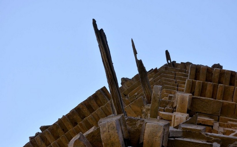 Un palo de madera que sobresale de cada esquina de la torre octogonal solía servir para colgar las campanas, en Luoyang, provincia de Henan, el 20 de mayo. [Foto/CFP]