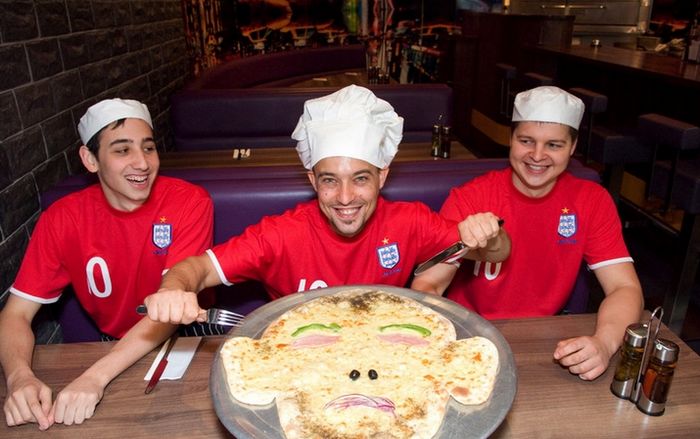 Una pizza con la imagen de la estrella del fútbol Rooney en una pizzería para celebrar la Copa del Mundo, el 18 de junio de 2010 en Londres, Reino Unido.[Foto/IC]