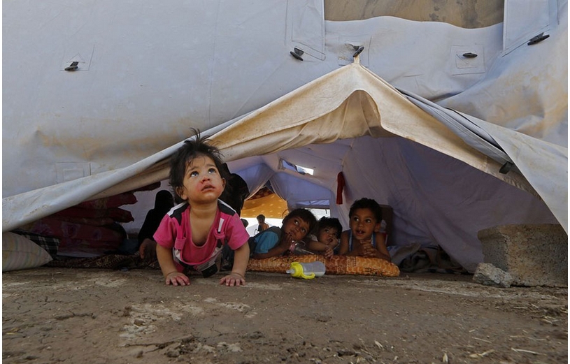 Ni?os iraquíes desplazados dentro de una carpa de ACNUR en un campamento temporal para las personas que huyen de la violencia en el norte de Irak, el 17 de junio de 2014 en Aski kalak, 40 kilómetros al oeste de la capital de la región autónoma kurda de Arbil. [Foto/CFP]