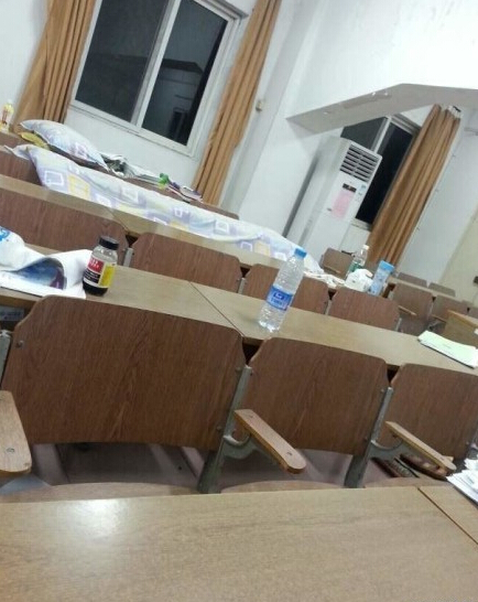 Parece más un centro de evacuación que un aula de universidad, pero es donde los alumnos duermen para huir del calor sofocante de sus dormitorios, el 23 de julio de 2014.