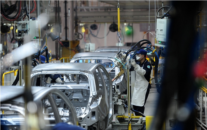 Trabajadores ensamblan vehículos en una planta automotriz de BAIC Motor en la ciudad de Zhuzhou, Hunan. 5 de marzo de 2012. [Foto/IC]