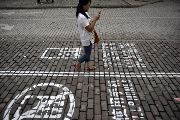 Personas caminan por una acera que se divide en dos vías: una para los que utilizan teléfonos celulares, y la otra para los que no lo usan. Chongqing. |