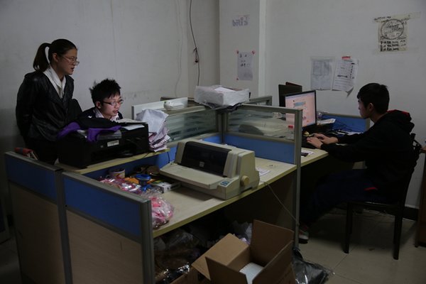 Empleados de la tienda de Huang se ocupan de atender a los clientes en línea. El sótano de la casa se utiliza como la oficina y el almacén de los productos. Debido al aumento de las ventas, para el a?o próximo Huang necesitará alquilar un almacén más grande. [Foto: PPC]
