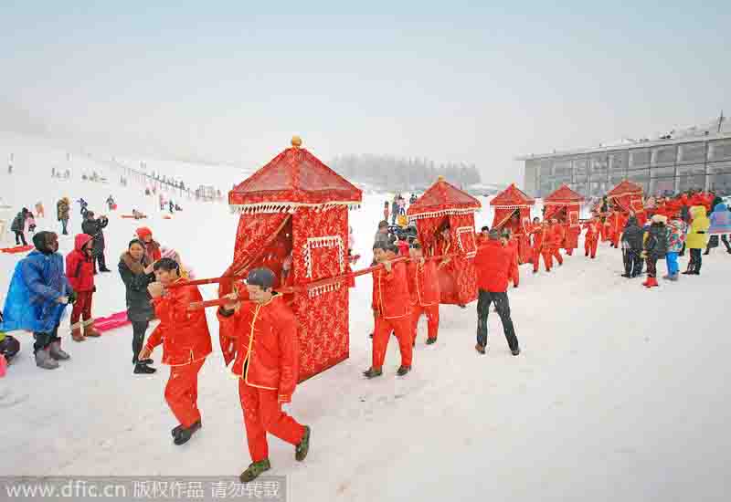 Chongqing, 31/12/2014(El Pueblo en Línea)- El 27 de diciembre comenzó el VI Festival de Hielo y Nieve de la Monta?a Xiannu en Wulong, municipalidad en Chongqing. Noventa y nueve parejas de recién casados, incluyendo extranjeros y parejas de personas mayores celebraron una romántica boda colectiva al estilo Han durante la inauguración del festival. En la celebración se pudieron ver elementos tradicionales de las bodas de estilo Han como pueden ser los trajes de seda roja, las diademas y túnicas de Phoenix y un hermoso paisaje cubierto de nieve. La boda colectiva de este a?o podría formar parte del libro Guinness de los récords. [Foto/IC]