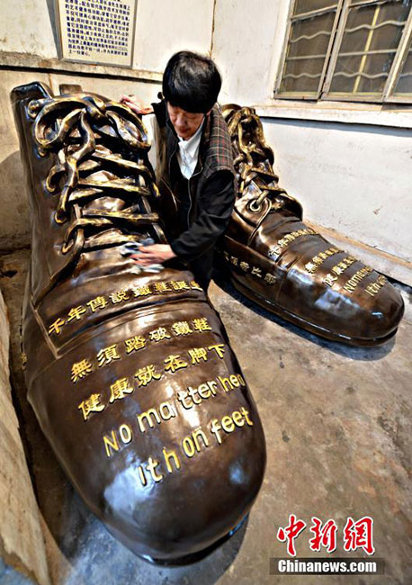 Zheng Chenggan, de 67 a?os, en la ciudad de Fuzhou ha realizado los zapatos de cobre más grandes del mundo.(Foto: CNS/Zhang Bin)