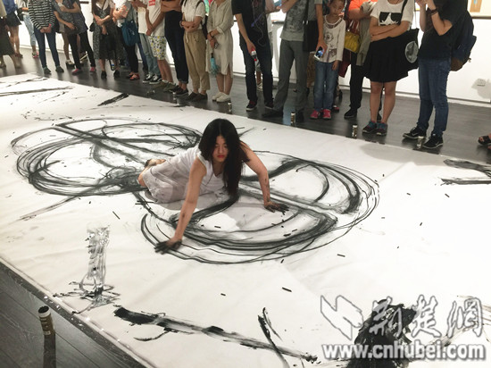 Wuhan,27/05/2015(El Pueblo en Línea)-Una artista pinta usando su cuerpo en una exposición en Wuhan, provincia de Hubei, el 22 de mayo de 2015.