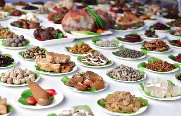 Muestra de un banquete con 108 platos típicos de Mongolia Interior realizados con piedra en el primero día de la Exposición Nacional de Joyería y Gemas de Zhejiang, que comenzó en la ciudad de Yiwu este sábado.