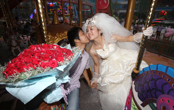 Un joven chino le propone matrimonio a su amada mientras disfrutan de un carrusel en un parque de diversiones.