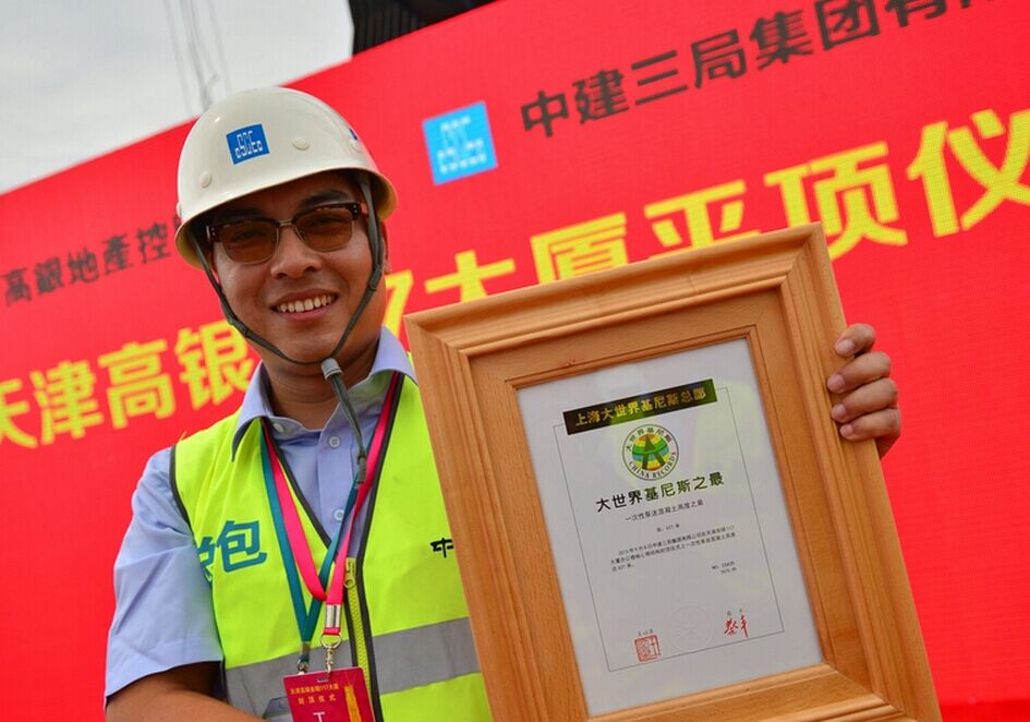 Un empleado de la empresa muestra el certificado del récord Guinness logrado durante la construcción de la Torre de Tianjin. [Foto: PPC]