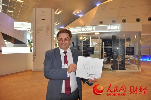 Alexander Idrisov viene de Rusia y es responsable de la empresa consultora estratégica Strategy Partners Group. Es muy optimista sobre la economía china y tiene tanta confianza que escribió la palabra "Trust” (confianza). En su opinión, el mayor desafío de la economía china es la transformación de impulso con inversiones en infraestructura a impulso con consumo. Aunque habrá desafíos, confía en la economía china.