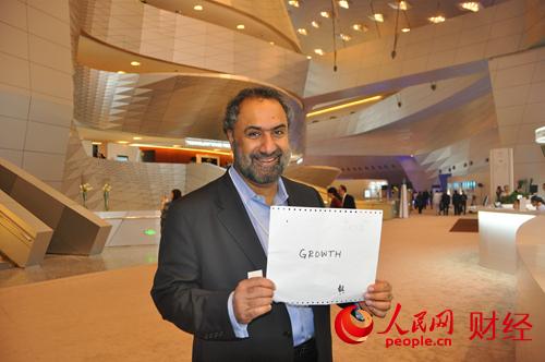 Dipender Saluja, presidente estadounidense de Capricorn Investment Group y profesor de consultoría en la Universidad de Stanford escribió la palabra "growth” (crecimiento). Cree que China es una de las mayores economías del mundo, con un crecimiento significativo, y donde existe mucha demanda. Espera que la economía de China mantenga su crecimiento y tenga una conexión más estrecha con el mundo.