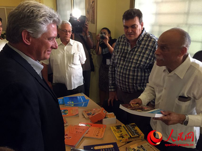 Arsenio Alemán, director cubano del Instituto Confucio de La Habana (a la izquierda), muestra a Miguel Díaz-Canel, primer vicepresidente del Consejo de Estado y de Ministros de Cuba la bibliografía disponible para el estudio del idioma chino y las publicaciones realizadas. (Foto: YAC)