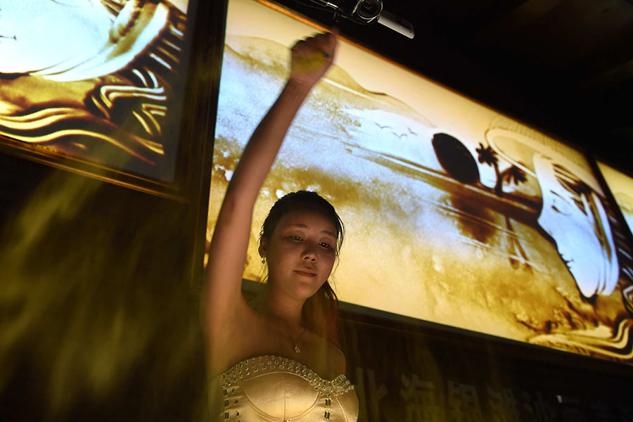 Después de esa corta etapa, Guo comenzó a aprender pintura con arena de Li Taishan, un conocido artista chino de este material. Invitada por un grupo de turismo de Beihai, región autónoma Zhuang de Guangxi, Guo siguió a Li para hacer realidad su sue?o de arena. Guo y su maestro realizaron una exhibición de pintura con arena en un pabellón de Beihai. [Foto/Xinhua]