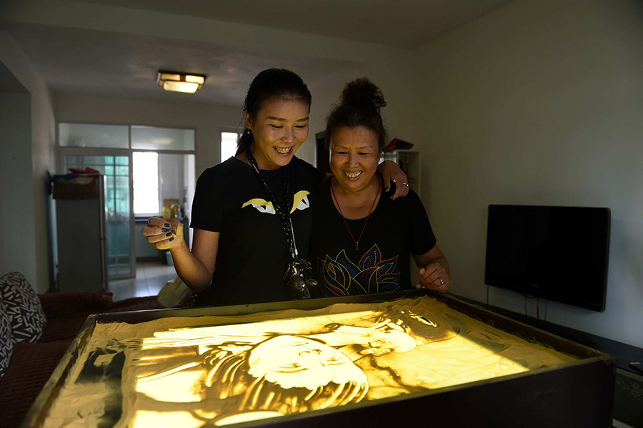 Guo Ziqi dibuja un retrato de su madre y escribe "Mamá, te quiero" en la pintura con arena. [Foto/Xinhua]