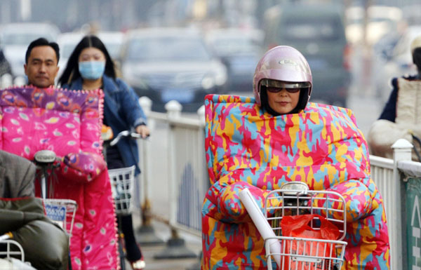 Algunos conductores de moto se decidieron por cubrirse con una moto-manta en Lianyungang, provincia de Jiangsu, esta semana de oto?o, en la que las temperaturas no llegaron a superar los 6 grados centígrados como consecuencia del aire frío que sopla en la región.