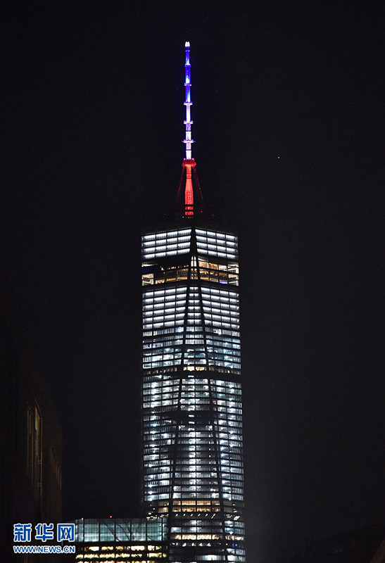 El nuevo World Trade Center de Nueva York, también se unió a la iniciativa adoptada por varios países del mundo, mostrando los colores de la bandera francesa.