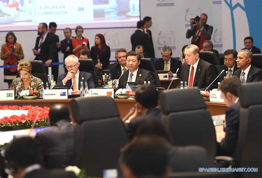 En la primera sesión de la cumbre, los líderes de los miembros del G20 pidieron reforzar la coordinación de políticas macroeconómicas para hacer frente al lento crecimiento económico.