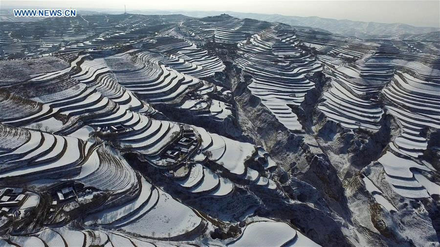 Imagen aérea del 9 de octubre de 2015 muestra las terrazas nevadas de Qinglanshan en la ciudad Dingxi, provincia de Gansu. [Foto/Xinhua]