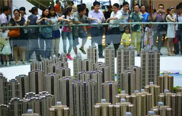 Personas eligen departamentos en una compa?ía inmobiliaria de Yichang, en Hubei, el 5 de julio de 2015.