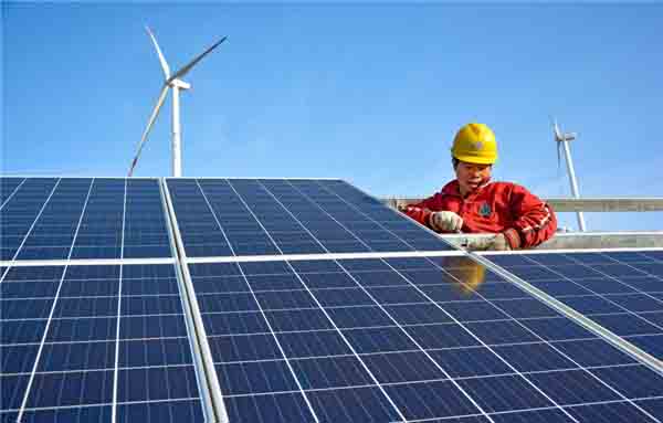 Un trabajador instala paneles solares frente a unas turbinas de viento en una estación de energía fotovoltaica en el condado de Yiyang, en Luoyang, provincia central china de Henan, el 19 de enero de 2016.