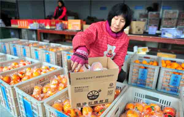 Una mujer empaqueta naranjas que sus clientes han comprado en línea en Yichang, Hubei, el 7 de enero de 2016.