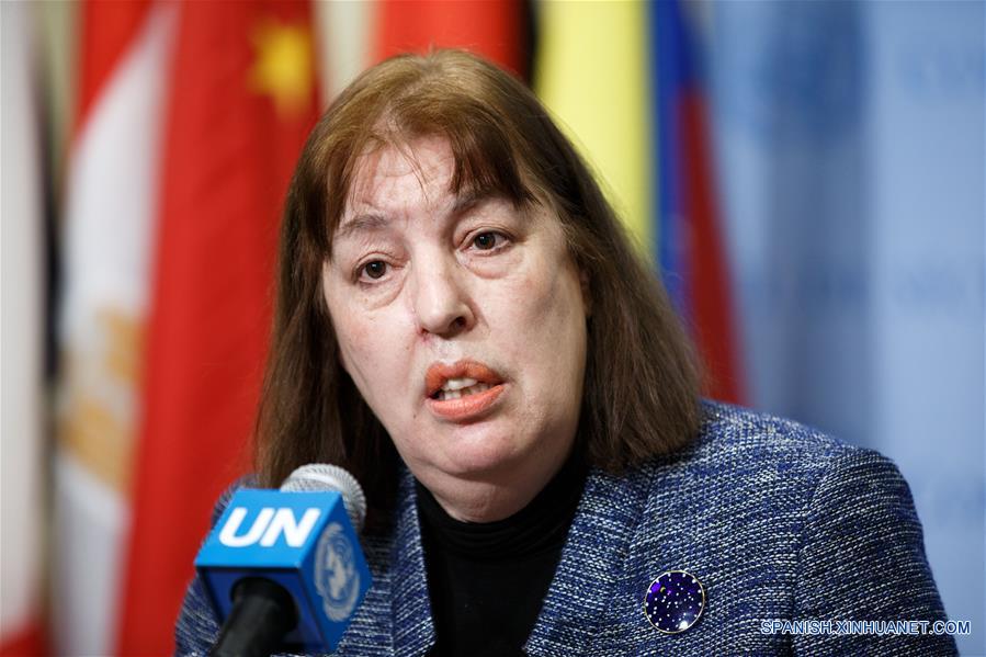 Virginia Gamba, jefe del Consejo de Seguridad Mecanismo Conjunto de Investigación en Química Arma Uso en Siria, informa a la prensa después de su exposición ante el Consejo de Seguridad sobre los mecanismos primer informe, en la sede de las Naciones Unidas en Nueva York 22 de febrero 2016.(Xinhua/Li Muzi)