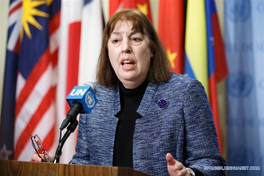 Virginia Gamba, jefe del Consejo de Seguridad Mecanismo Conjunto de Investigación en Química Arma Uso en Siria, informa a la prensa después de su exposición ante el Consejo de Seguridad sobre los mecanismos primer informe, en la sede de las Naciones Unidas en Nueva York 22 de febrero 2016.(Xinhua/Li Muzi)