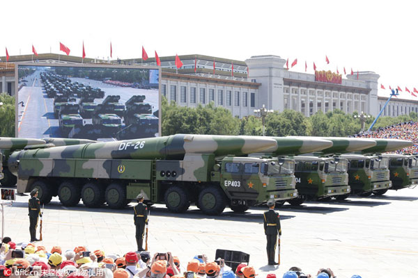 Misiles balísticos 26DF desfilan en Beijing durante el acto de conmemoración del 70 aniversario de victoria antifascista durante la Segunda Guerra Mundial.
