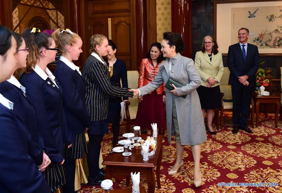 Peng Liyuan, la esposa del presidente chino Xi Jinping, se reúne con un grupo de estudiantes y maestros de Sydney, en Beijing, capital de China, 19 de abril de 2016. (Xinhua / Zhang Duo)