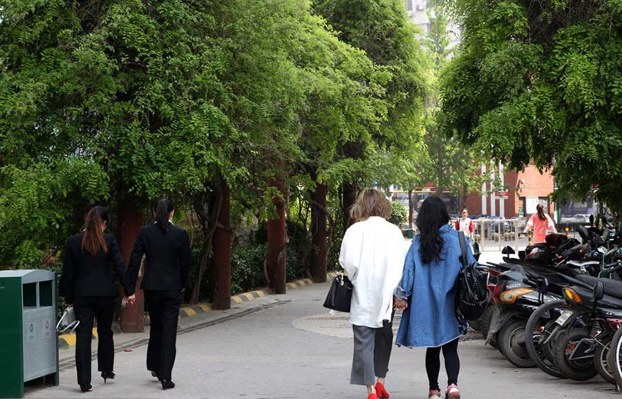 Mi (derecha) y una compa?era van de compras después de trabajar, en Zhengzhou, provincia de Henan, el 19 de abril de 2016.