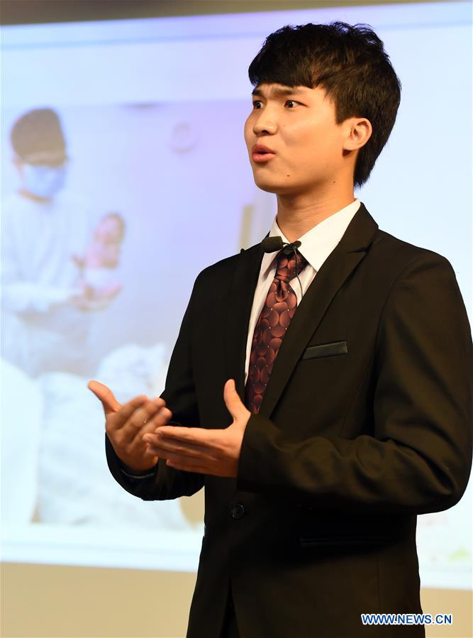 Beijing, 12 de mayo de 2016 (Xinhua)—Un enfermero ofrece un discurso durante la ceremonia de entrega de premios el Día Internacional de los Enfermeros en el Hospital Xuanwu de Beijing, el 12 de mayo de 2016. (Xinhua/Zhang Yuwei)