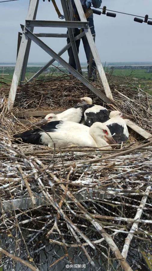 Un trabajador de la compa?ía eléctrica estatal State Grid fotografía un nido de cigüe?a blanca oriental sobre una torre de transmisión de electricidad, que mide 35,7 metros de altura, en la provincia de Jiangxi, el 17 de mayo de 2016. La cigüe?a blanca oriental es una especie en peligro de extinción. Teniendo en cuenta el informe meteorológico sobre una tormenta que se avecina en los próximos días, el trabajador se subió a la torre para reforzar el nido. El trabajador dijo que el nido no afecta a la transmisión de electricidad, pero necesitan consejos de expertos sobre cómo proteger mejor estas aves que anidan en las torres de electricidad. [Foto: weibo.com]