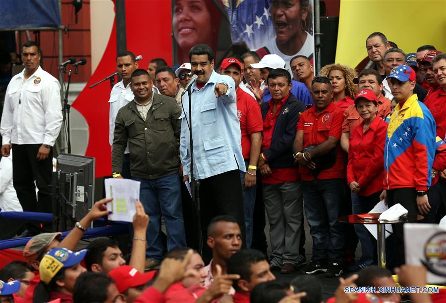 CARACAS, mayo 31, 2016 (Xinhua) -- El presidente de Venezuela, Nicolás Maduro (c), pronuncia un discurso durante un acto para recibir a la caravana de transportistas, taxistas y motorizados que participan en la marcha en Defensa de la Patria, en el Palacio de Miraflores, en Caracas, capital de Venezuela, el 31 de mayo de 2016. Nicolás Maduro dijo el martes que el secretario general de la Organización de los Estados Americanos (OEA), Luis Almagro, "usurpa" funciones en el organismo al invocar la Carta Democrática Interamericana (CDI) para Venezuela. (Xinhua/Fausto Torrealba/AVN)