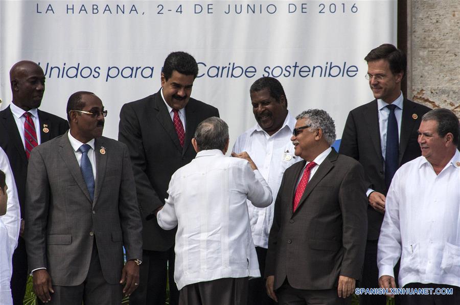 El presidente de Cuba, Raúl Castro (3-d-frente), conversa con el presidente de Venezuela, Nicolás Maduro (3-d-atrás), mientras asisten a la toma de la fotografía oficial de la VII Cumbre de la Asociación de Estados del Caribe (AEC), en La Habana, Cuba, el 4 de junio de 2016. Presidentes de los países miembros de la AEC ratificaron el sábado el compromiso de buscar acciones concretas comunes para afrontar el cambio climático que amenaza la existencia misma de algunas naciones del área. (Xinhua/Str)