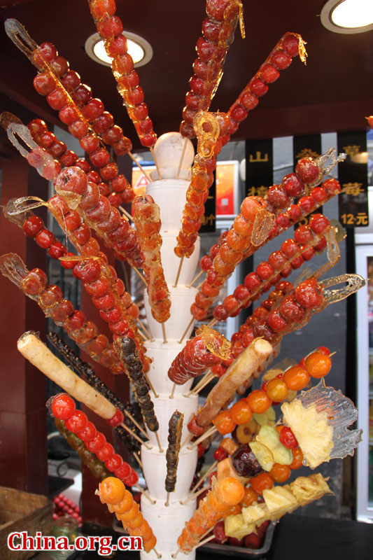Tanghulu es una sarta de frutas acarameladas perfecta para una tener una merienda saludable. A menudo se compone de 7 u 8 piezas de fruta, que pueden ser fresas, uvas y pi?as. El Taghulu de la foto contiene principalmente fresas cubiertas de caramelo. [Foto: Yu Winglam]