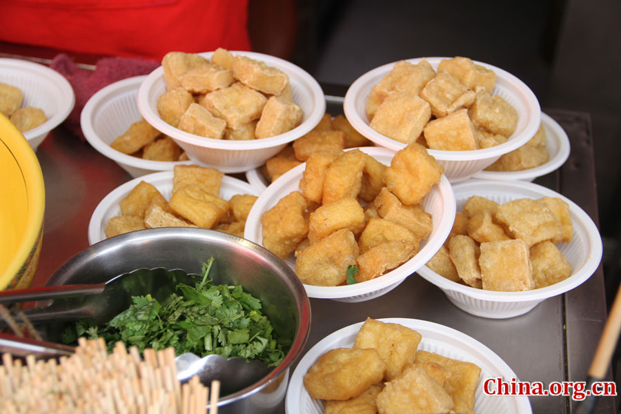 Mucha gente tiene miedo de comer el llamado “tofu apestoso”. De hecho, no es más que el queso de soja fermentada frito, con una salsa mixta y un poco de cilantro. [Foto: Yu Winglam]