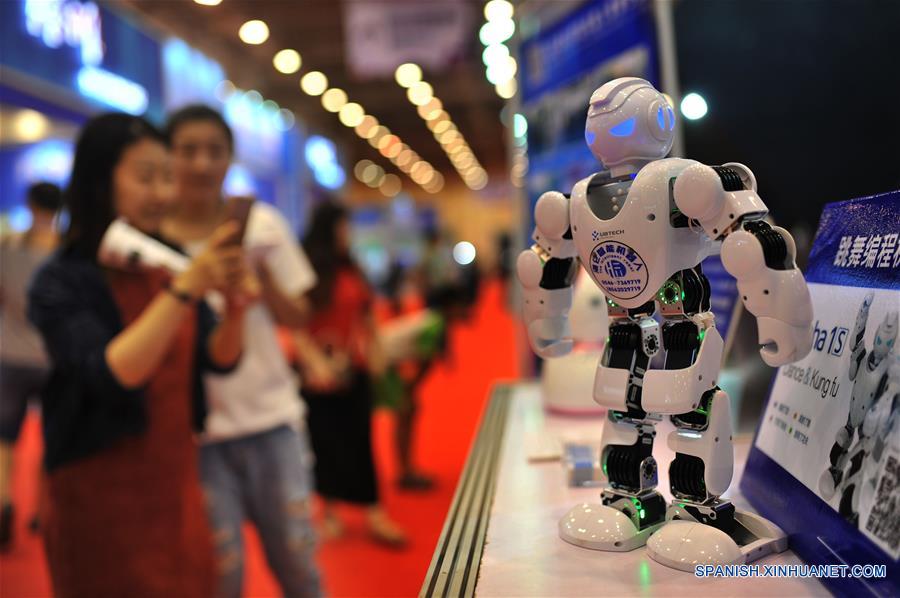 QINGDAO, julio 7, 2016 (Xinhua) -- Un robot es exhibido durante la Feria de Electrónica de Consumo 2016 en Qingdao, en la provincia de Shandong, en el este de China, el 7 de julio de 2016. La feria inició el jueves. (Xinhua/Wang Haibin)