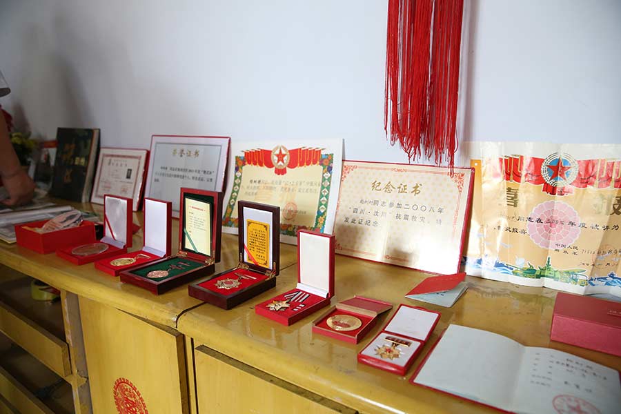 Medallas y certificados de Yang sobre la mesa.