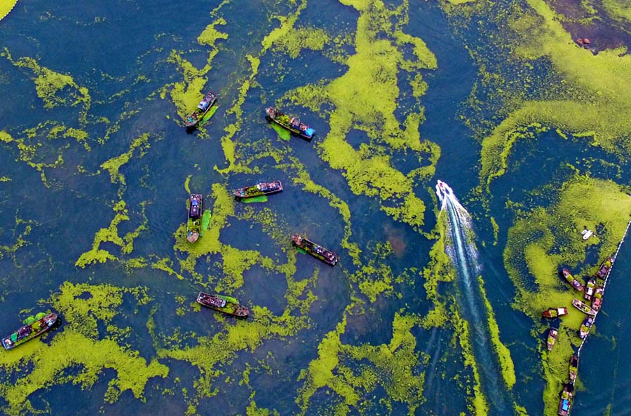 Foto aérea de varios barcos intentando empujar mar a dentro las algas de la costa de Qingdao, provincia de Shandong, el miércoles.