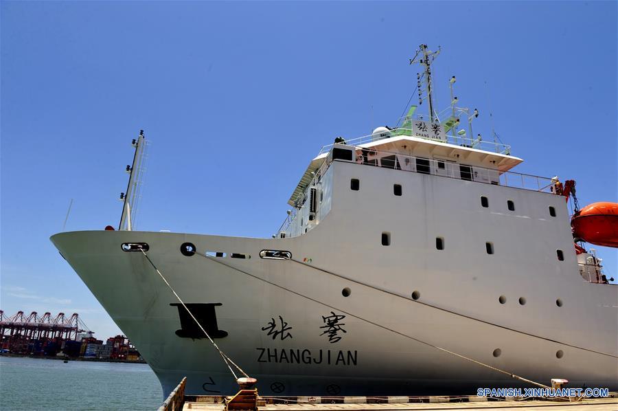 SHENZHEN, julio 23, 2016 (Xinhua) -- El barco explorador de aguas profundas, Zhang Jian, es anclado en el Muelle Chiwan de Shenzhen, en el sur de China, el 23 de julio de 2016. El barco explorador zarpó este sábado de Shenzhen. Su destino en aguas de la fosa de Nueva Breta?a, que tiene más de 8,000 metros de profundidad en el mar de Solomón frente a la costa de Papúa Nueva Guinea. (Xinhua/Zhang Jiansong)