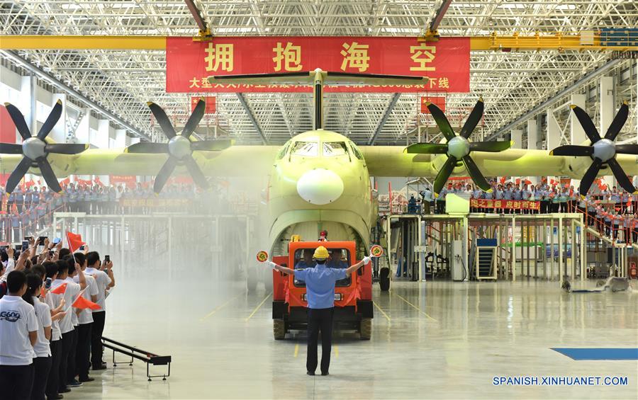 La aeronave anfibia AG600 sale de la línea de producción en Zhuhai, en la provincia de Guangdong, en el sur de China, el 23 de julio de 2016.La aeronave que tiene un peso máximo de despegue de 53.5 toneladas y un rango de vuelo máximo de 4,500 km, será utilizado para combatir incendios forestales y realizar misiones de rescate marino. El AG600 es por mucho la aeronave anfibia más grande del mundo, cerca del tama?o de un BOeing 737. (Xinhua/Liang Xu)