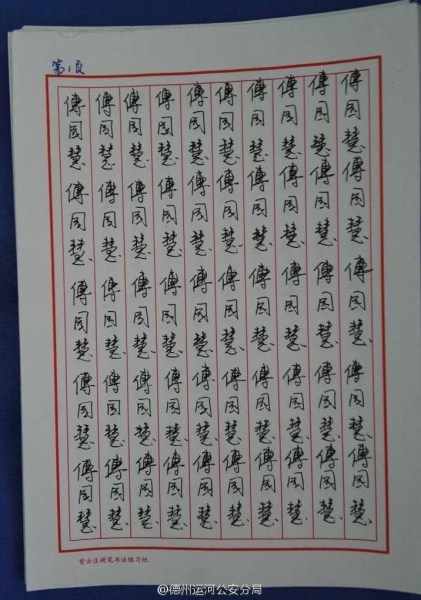 Jinan,11/08/2016(El Pueblo en Línea)-La tarde del 10 de agosto, un policía de Yunhe en la ciudad de Dezhou, provincia de Shandong, publicó en su blog de Weibo imágenes en las que mostraba papeles donde él mismo escribió a mano el nombre de la nadadora Fu Yuanhui hasta 1.000 veces, en un intento por dar ánimo a los atletas chinos que participan en las Olimpiadas de Río.