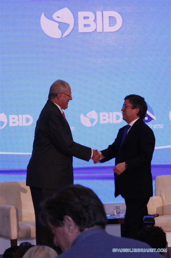 LIMA, agosto 22, 2016 (Xinhua) -- El presidente peruano, Pedro Pablo Kuczynski (i), estrecha la mano del presidente del Banco Interamericano de Desarrollo (BID), Luis Alberto Moreno (d), durante el evento "HydroPerú 2030" del BID, en la ciudad de Lima, Perú, el 22 de agosto de 2016. De acuerdo con información de la prensa local, "HydroPerú 2030" presenta las oportunidades y desafíos para implementar los servicios de agua y saneamiento en Perú en los próximos 15 a?os. (Xinhua/Luis Camacho)