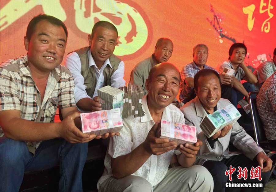 Alrededor de 5,6 millones de yuanes (850.000 dólares) se distribuyeron el sábado entre 80 familias que participaron en un programa de plantación de árboles en un pueblo del condado de Lintao, en la provincia de Gansu. [Foto / Chinanews.com]