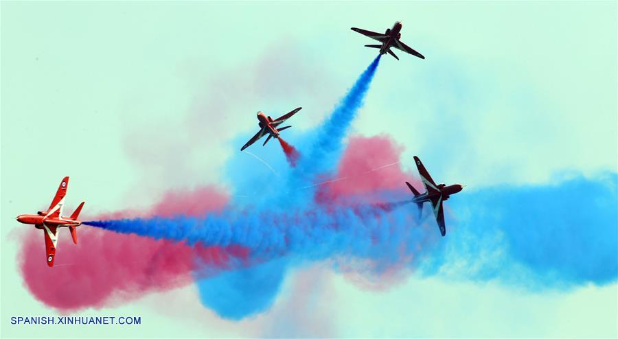 ZHUHAI, noviembre 3, 2016 (Xinhua) -- Red Arrows, equipo acrobático de la Real Fuerza Aérea británica participan en la XI Exhibición Internacional de Aviación y Aeroespacial de China, en Zhuhai, provincia de Guangdong, en el sur de China, el 2 de noviembre de 2016. (Xinhua/Cai Yang)