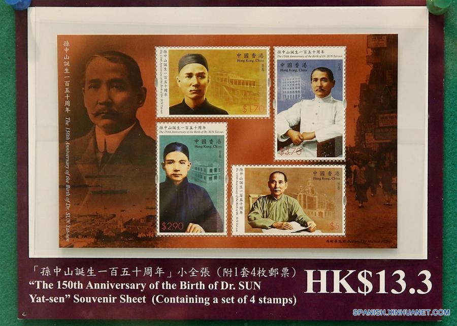 Vista de una cuatro estampillas conmemorativas por el 150 aniversario del nacimiento de Sun Yat-sen, en Hong Kong, en el sur China, el 12 de noviembre de 2016. El Correo de Hong Kong emitió el sábado una serie de estampillas conmemorativas por el 150 aniversario del nacimiento de Sun Yat-sen. (Xinhua/Wang Shen)