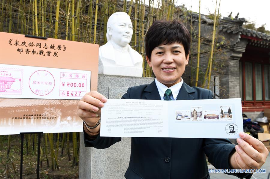 Un empleado muestra estampillas conmemorativas del 150 aniversario del nacimiento de Sun Yat-sen, en la exresidencia de su esposa, Soong Ching Ling, en Beijing, capital de China, el 12 de noviembre de 2016. El Correo de China emitió un conjunto de estampillas conmemorativas por el 150 aniversario del nacimiento de Sun Yat-sen el sábado. (Xinhua/Li He)