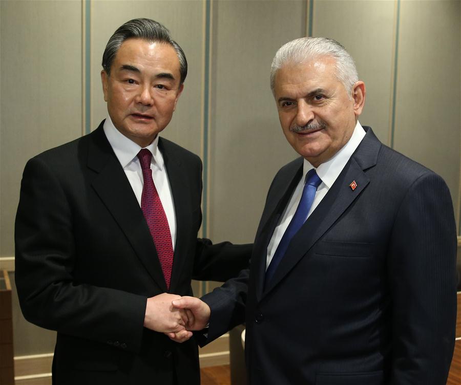 El ministro de Relaciones Exteriores de China de visita en Ankara, Wang Yi, se reunió en la capital turca con el primer ministro Binali Yildrim. (Xinhua/Oficina presidencial turca)