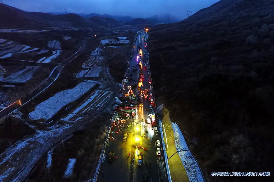 SHANXI, noviembre 21, 2016 (Xinhua) -- Vista del sitio de una colisión en la sección de Pingyang de la Autopista Beijing-Kunming, en la provincia de Shanxi, en el norte de China, el 21 de noviembre de 2016. Un total de 17 personas murieron y otras 37 resultaron heridas luego de que 56 vehículos se accidentaran en la Autopista Beijing-Kunming el lunes. (Xinhua/Zhan Yan)