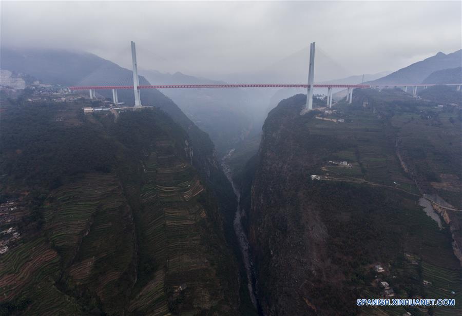 YUNNAN, diciembre 29, 2016 (Xinhua) -- Vista del Puente Beipanjiang que une al municipio de Duge de la ciudad de Liupanshui en la provincia de Guizhou, en el suroeste de China y el municipio de Puli de la ciudad de Xuanwei de la provincia de Yunnan, en el suroeste de China, el 29 de diciembre de 2016. El Puente Beipanjiang de 1,341.4 metros de longitud fue puesto el jueves en operación. (Xinhua/Pu Chao)